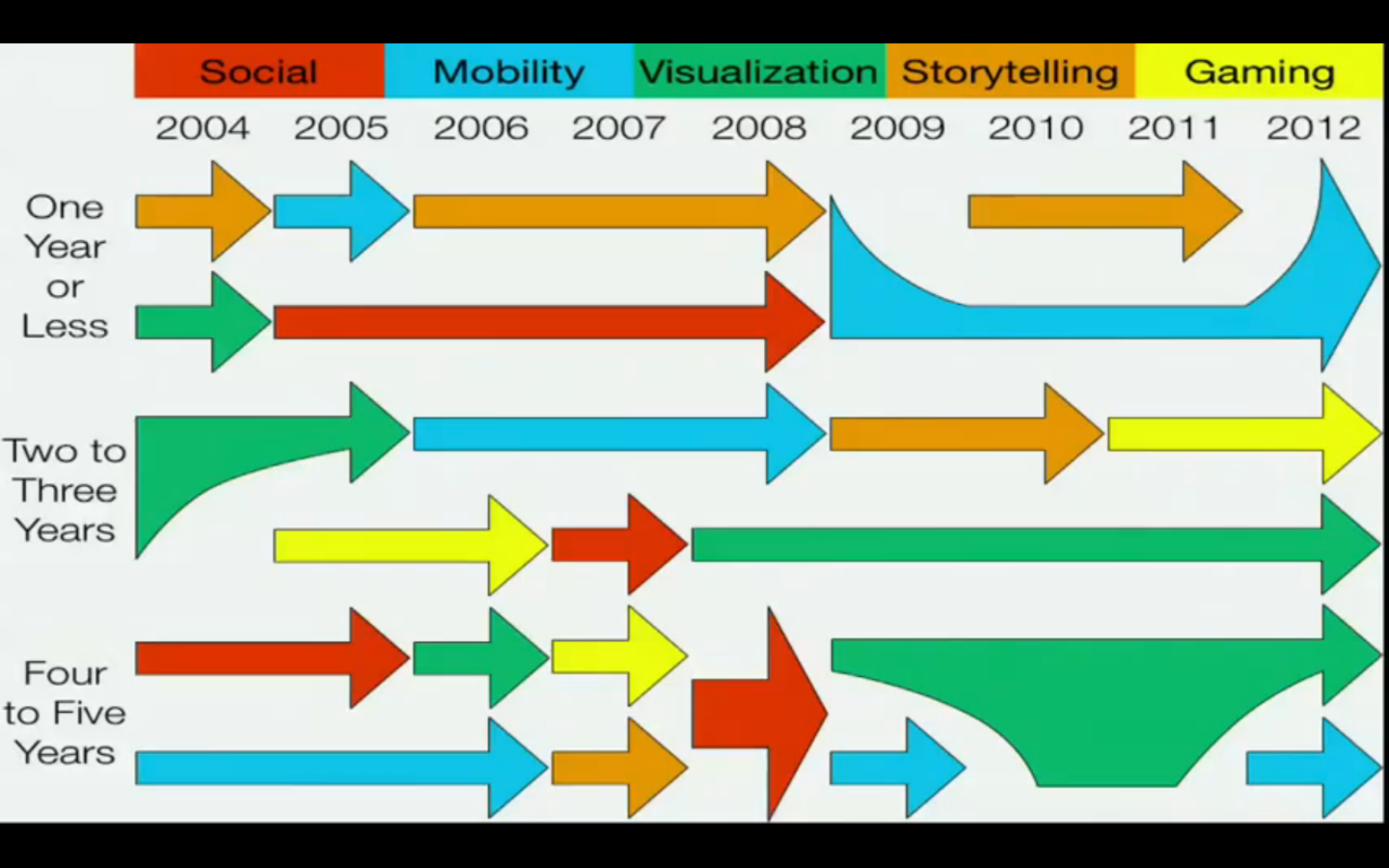 This is a chart that Ruben Puentedura put together using The Horizon Report’s trend predictions color-coded to reflect these aspects: social, visual, gaming, mobility, and storytelling. His is a fascinating view of how technology fits into the human condition.